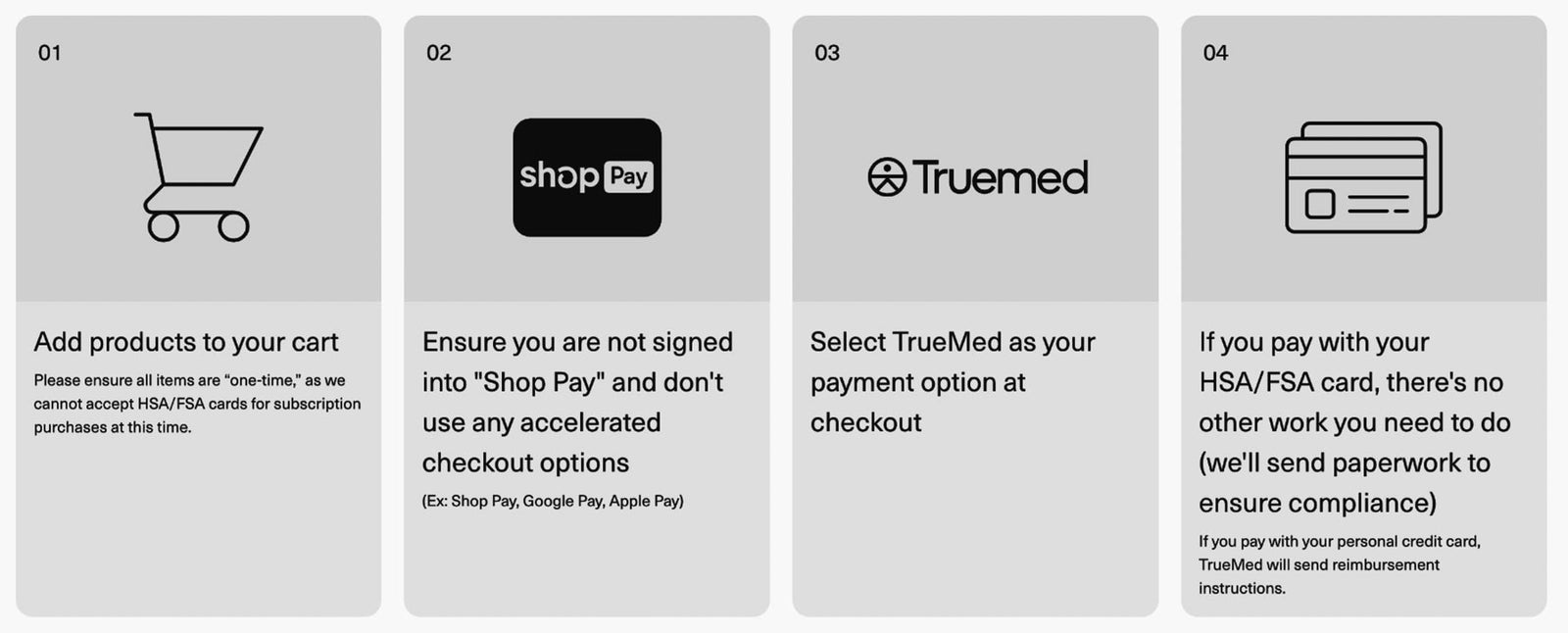 • If you pay with your HSA/FSA card, there's no other work you need to do (TrueMed will send paperwork to ensure compliance). If you pay with your personal credit card, TrueMed will send reimbursement instructions.